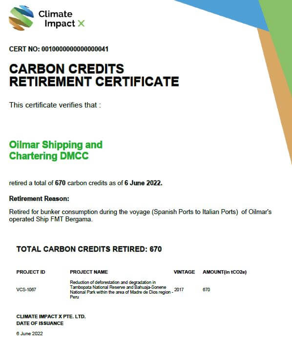 We are pleased to announce our new desk on Carbon Market. With this Oilmar’s marine fuel trading division has successfully conducted its first carbon neutral voyage on FMT Bergama from Spanish port of Huelva to Italian Port of Naples.